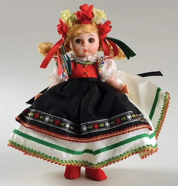 Then one Christmas I received a Polish doll. She wore a traditional folk costume in vivid red, black, and white, with a floral wreath and trailing ribbons, a lace-trimmed blouse, a red vest, and a full embroidered skirt, beneath which were the cutest little red boots. I took her out of the box immediately and gave her a special place on my bedroom shelf.